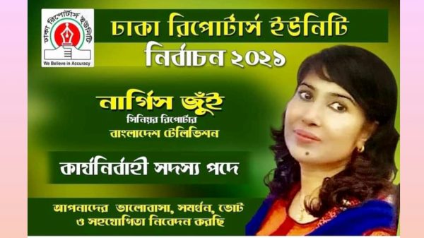 ঢাকা রিপোটার্স ইউনিটির (ডিআরইউ) ২০২১ মেয়াদের কার্যনির্বাহী কমিটির নির্বাচনে কার্যনির্বাহী সদস্য পদে বিটিভির সিনিয়র রির্পোটার নার্গিস জুঁইকে সকলে সহযোগিতা, সমর্থন ও ভোট দিয়ে জয়ী করুন!