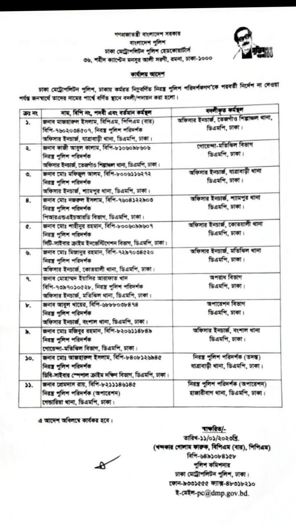 আজ বুধবার (১১ জানুয়ারি ২০২৩ খ্রি.) ঢাকা মেট্রোপলিটন পুলিশ কমিশনার খন্দকার গোলাম ফারুক বিপিএম-বার, পিপিএম স্বাক্ষরিত এক অফিস আদেশে এ পদায়ন করা হয়।