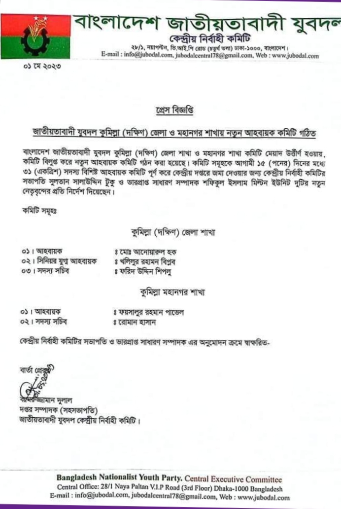 বাংলাদেশ জাতীয়তাবাদি যুবদল কুমিল্লা (দক্ষিণ) জেলা ও মহানগর শাখার আহ্বায়ক কমিটি ঘোষণা করা হয়েছে।