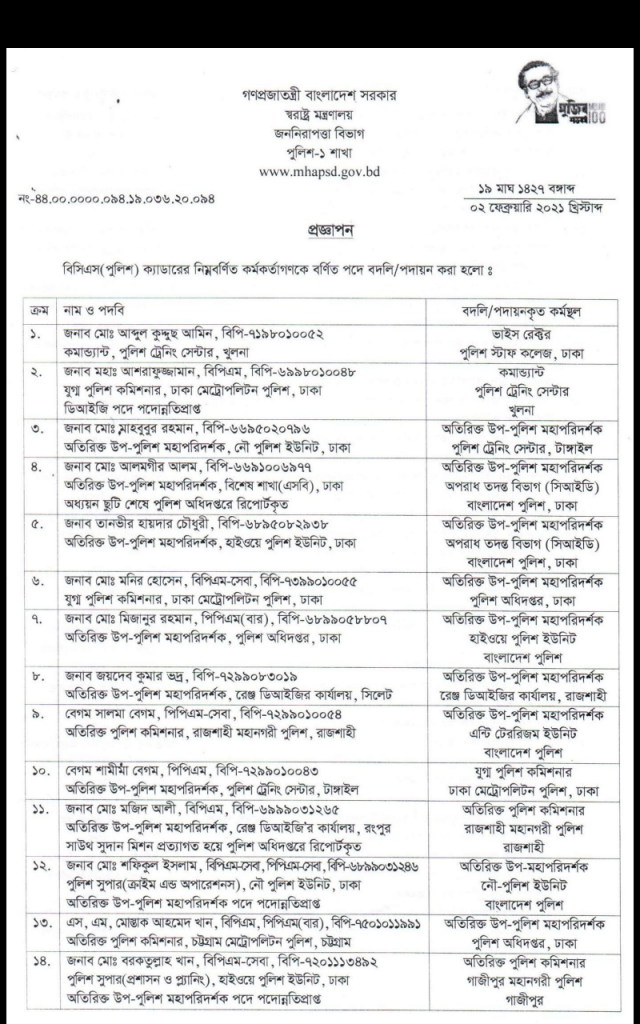 বাংলাদেশ পুলিশের অতিরিক্ত ডিআইজি পদমর্যাদার ৩১ জন কর্মকর্তাকে পদায়ন করা হয়েছে। ০২ ফেব্রুয়ারি, ২০২১ স্বরাষ্ট্র মন্ত্রণালয়ের জননিরাপত্তা বিভাগের উপসচিব ধনঞ্জয় কুমার দাস স্বাক্ষরিত প্রজ্ঞাপনে এই পদায়ন করা হয়।