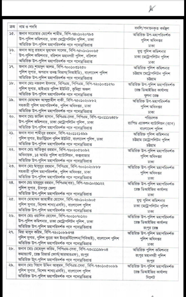 পুলিশের অতিরিক্ত ডিআইজি পদমর্যাদার ৩১ জন কর্মকর্তাকে পদায়ন