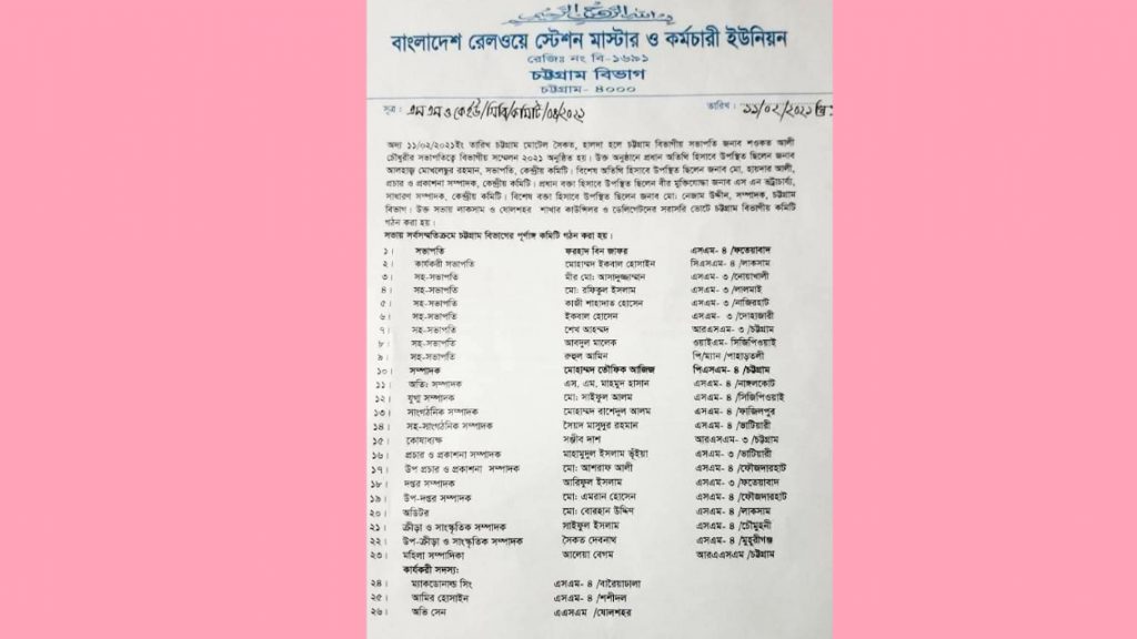 বাংলাদেশ রেলওয়ে স্টেশন মাষ্টার ও কর্মচারী ইউনিয়ন চট্টগ্রাম বিভাগের বিভাগীয় সম্মেলন ১১ ফেব্রুয়ারি চট্রগ্রামের একটি রিসোর্টে অনুষ্টিত হয়। চট্রগ্রাম বিভাগীয় সভাপতি শওকত আলীর সভাপতিত্বে ২০২১ সালে সম্মেলনে প্রধান অতিথি হিসেবে উপস্থিত ছিলেন কেন্দ্রীয় কমিটির সভাপতি আলহাজ্ব মোখলেছুর রহমান। সভায় লাকসাম ও ষোলশহর শাখার কাউন্সিলর ও ডেলিগেটদের সরাসরি ভোটে চট্রগ্রাম বিভাগীয় কমিটি গঠন করা হয়। সভায় সর্বসম্মতিক্রমে কার্যকরি সভাপতি হিসেবে নির্বাচিত হোন লাকসাম জংশন ও রেলওয়ের সহকারী স্টেশন মাষ্টার ইকবাল হোসাইন। পুরো কমিটির তালিকা নিচে দেওয়া হল।