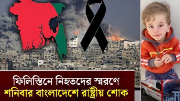 বর্বরজাতি ইসরায়েলি বাহিনীর হামলায় ফিলিস্তিনির শত শত নারী শিশুসহ হাজার হাজার নাগরিকদের মৃত্যুর ঘটনায় আজ শনিবার (২১ অক্টোবর) রাষ্ট্রীয় শোক পালন করবে বাংলাদেশ। এর আগে গত বৃহস্পতিবার (১৯ অক্টোবর) একদিনের
