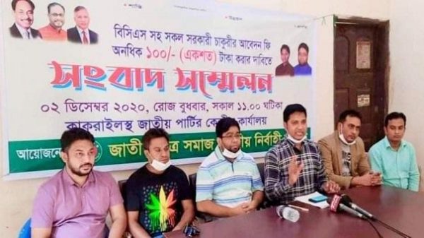 সরকারি চাকরির আবেদন ফি ১০০ টাকা করার দাবি জানিয়েছে জাতীয় পার্টির ছাত্রসংগঠন জাতীয় ছাত্র সমাজ।বুধবার (২ ডিসেম্বর) সকালে সংগঠনটির কেন্দ্রীয় কার্যালয়ে আয়োজিত এক সংবাদ সম্মেলনে এ দাবি উত্থাপন করা হয়।সংগঠনটির