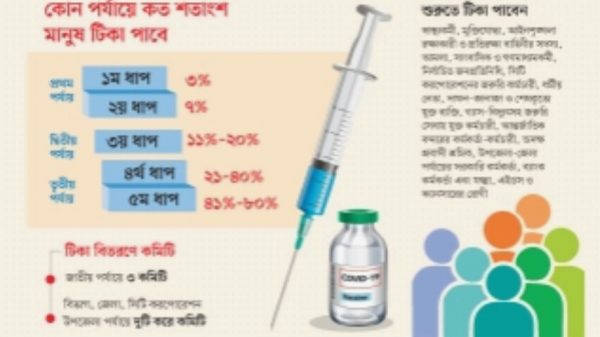 ঝুঁকিপূর্ণ জনগোষ্ঠীকে আগে টিকা দেওয়া হবে । ন্যায্যতা ও সমতা নিশ্চিত করার কথা বলছেন জনস্বাস্থ্যবিদেরা শুরুতে সরকার প্রায় ৫২ লাখ মানুষকে করোনার টিকা দিতে চায়। তিনটি পর্যায়ে পাঁচ ধাপে মোট