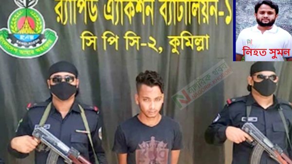 কুমিল্লা ইপিজেডের সামনে প্রকাশ্যে খাইরুল বাশার সুমন হত্যা মামলার প্রধান আসামি মো. মহিউদ্দিন (২১) নামের যুবককে গ্রেফতার র্যাব ১১ সিপিসি ২ এর গোয়েন্দা সদস্যরা। শুক্রবার ৭ মে ভোর বেলা কুমিল্লার সদর
