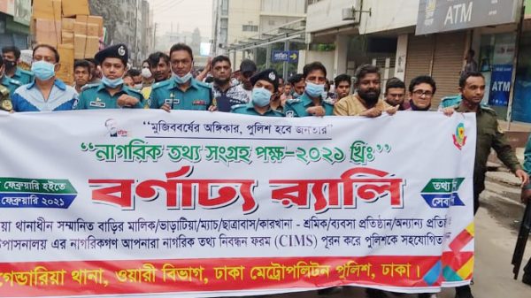 নাগরিক তথ্য সংগ্রহ পক্ষ-২০২১” সফল করার লক্ষ্যে বিশেষ শোভাযাত্রা আয়োজন করেছে ঢাকা মেট্রোপলিটন পুলিশের (ডিএমপি) গেন্ডারিয়া থানা পুলিশ। নাগরিক তথ্য সংগ্রহের জন্যে জনসচেতনতা বৃদ্ধির লক্ষ্যে আয়োজিত এ র্যালির মূল প্রতিপাদ্য
