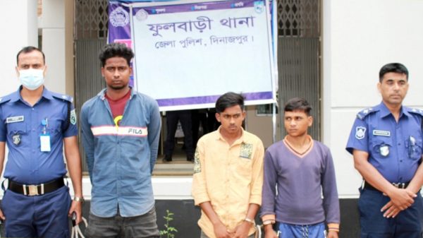 দিনাজপুরের ফুলবাড়ীতে এক তরুণীকে ধর্ষণ করে মোবাইলে ভিডিও ধারণের অভিযোগে তিন যুবককে গ্রেফতার করেছে পুলিশ। রোববার (১০ এপ্রিল) দুপুরে তাদের কারাগারে পাঠানো হয়েছে। এর আগে শনিবার দিনগত রাতে বিভিন্ন এলাকা
