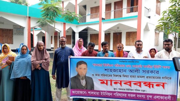 গাইবান্ধার গোবিন্দগঞ্জ উপজেলার শালমারা ইউনিয়ন পরিষদের এক সদস্য শাহজাহান আলীর বিরুদ্ধে করা হত্যা মামলা প্রত্যাহার ও মানবাধিকার প্রতিষ্ঠার দাবিতে গতকাল শনিবার ইউপি সদস্যদের উদ্যোগে ইউনিয়ন পরিষদ চত্বরে মানববন্ধন কর্মসূপি পালন